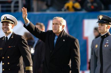 | Keywords: US Navy 041204-N-9693M-014 President Bush waves to crowd during 105th Army Navy game.jpg en Philadelphia Pa Dec 4 2004 President George W Bush waves to the crowd from mid-field escorted by the Navy Brigade Commander Travis Amerine left and the Army's First Captain Ryan Boeka during opening ceremonies at the 105th Army vs Navy Game The Navy Midshipmen defeated the Black Knights of Army 42-13 U S Navy photo by Mr Damon J Moritz RELEASED 2004-12-04 041204-N-9693M-014 Navy http //www navy mil/view_image asp id 19340 U S Navy photo by Mr Damon J Moritz PD-USGov-Military-Navy 2004 Army-Navy Game |