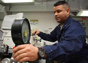 | Keywords: US Navy 041206-N-6495K-092 Machinist's Mate 2nd Class Miguel Toledo checks the pressure on a Liquid Oxygen (LOX) converter aboard the Nimitz-class aircraft carrier USS Harry S. Truman (CVN 75).jpg en Persian Gulf Dec 6 2004 - Machinist's Mate 2nd Class Miguel Toledo checks the pressure on a Liquid Oxygen LOX converter aboard the Nimitz-class aircraft carrier USS Harry S Truman CVN 75 Currently aircraft from Carrier Air Wing Three CVW-3 embarked aboard Truman are providing close air support and conducting intelligence surveillance and reconnaissance missions in ongoing operations over Iraq Truman s Carrier Strike Group Ten CSG-10 and CVW-3 are on a regularly scheduled deployment in support of the Global War on Terrorism U S Navy photo by Photographer s Mate Airman Kathaleen A Knowles RELEASED 2004-12-06 041206-N-6495K-092 Navy http //www navy mil/view_image asp id 19662 U S Navy photo by Photographer s Mate Airman Kathaleen A Knowles PD-USGov-Military-Navy Aboard USS Harry S Truman CVN-75 |