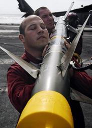 | Keywords: US Navy 041230-N-4166B-081 Aviation Ordnanceman attach an AIM-9 Sidewinder short range air-to-air missile onto the wing of an F-A-18F Super Hornet on the flight deck of USS Abraham Lincoln (CVN 72).jpg en Pacific Ocean Dec 30 2004 - Aviation Ordnanceman assigned to the Bounty Hunters of Strike Fighter Squadron Two VFA-2 attach an AIM-9 Sidewinder short range air-to-air missile onto the wing of an F/A-18F Super Hornet on the flight deck of USS Abraham Lincoln CVN 72 Lincoln and Carrier Air Wing Two CVW-2 are currently deployed to the Western Pacific Ocean Carrier Strike Group Nine CSG-9 is the first to be used in the Surge Role in support of the Chief of Naval Operations Fleet Response Plan FRP U S Navy photo by Photographer's Mate Airman Jordon R Beesley RELEASED 2004-12-30 041230-N-4166B-081 Navy http //www navy mil/view_image asp id 20129 U S Navy photo by Photographer's Mate Airman Jordon R Beesley PD-USGov-Military-Navy AIM-9 Sidewinder Aviation Ordnanceman Aboard USS Abraham Lincoln CVN-72 Strike Fighter Squadron 2 United States Navy |