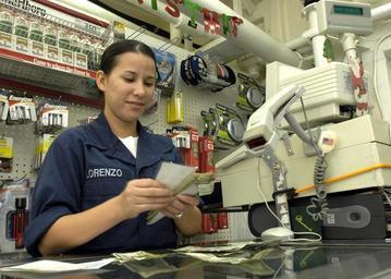 | Keywords: US Navy 050103-N-9079D-020 Seaman Jaimee Lorenzo counts money while working as a clerk in the ship store aboard the guided missile destroyer USS Benfold (DDG 65).jpg en Indian Ocean Jan 3 2005 - Seaman Jaimee Lorenzo counts money while working as a clerk in the ship store aboard the guided missile destroyer USS Benfold DDG 65 Benfold assigned to Carrier Strike Group Nine CSG-9 is currently conducting humanitarian operations in the wake of the Tsunami that struck South East Asia CSG-9 is currently operating in the Indian Ocean off the waters of Indonesia and Thailand U S Navy photo by Photographer's Mate Airman Ronald Dallatorre RELEASED 2005-01-03 050103-N-9079D-020 Navy http //www navy mil/view_image asp id 20027 U S Navy photo PD-USGov-Military-Navy Aboard USS Benfold DDG-65 Counting money |