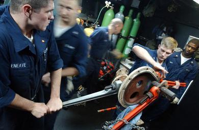 | Keywords: US Navy 050114-N-8148A-651 Machinist's Mate Fireman Roy Leneave, left, of Salem, Va., tightens his grip on a 24.jpg en Pacific Ocean Jan 14 2005 - Machinist's Mate Fireman Roy Leneave left of Salem Va tightens his grip on a 24 pipe wrench to hold a steam coil steady as Hull Maintenance Technician 3rd Class Jason Roosien of Grand Rapids Mich attempts to break free a nut aboard USS Ronald Reagan CVN 76 The Nimitz-class aircraft carrier Ronald Reagan is underway in the Pacific Ocean conducting routine carrier operations U S Navy photo by Photographer's Mate 3rd Class Kitt Amaritnant RELEASED 2005-01-14 050114-N-8148A-651 Navy http //www navy mil/view_image asp id 20824 U S Navy photo by Photographer's Mate 3rd Class Kitt Amaritnant PD-USGov-Military-Navy Maintenance on USS Ronald Reagan CVN-76 Hull Maintenance Technician United States Navy Pipe wrenches |