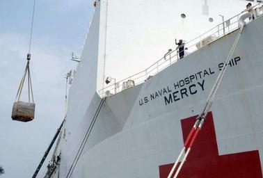 | Keywords: US Navy 050129-N-3372S-014 Supplies and medical materials been load onto the Military Sealift Command hospital ship USNS Mercy (T-AH 19).jpg en Singapore Jan 29 2005 - Members of the Naval Expeditionary Logistics Support Force NAVELSF Base Operating Support BOS contractors from the Naval Regional Contracting Center NRCC Singapore and Military Sealift Command mariners load supplies and medical materials onto the Military Sealift Command hospital ship USNS Mercy T-AH 19 Mercy has been forward deployed to support Operation Unified Assistance the humanitarian operation effort in the wake of the tsunami that struck Southeast Asia Mercy contains twelve fully equipped operating rooms a 1 000-bed hospital facility digital radiological services a diagnostic and clinical laboratory a pharmacy an optometry lab a cat scan and two oxygen-producing plants The hospital ship is a converted San Clemente-class super tanker Mercy is a very visible and humanitarian symbol of not only America s commitment to tsunami victims but also its enduring commitment to the people of the region U S Navy photo by Journalist 1st Class Paul G Scherman RELEASED 2005-01-29 050129-N-3372S-014 Navy http //www navy mil/view_image asp id 21319 U S Navy photo by Journalist 1st Class Paul G Scherman PD-USGov-Military-Navy Naval ships of the United States in Singapore American Red Cross Aboard USNS Mercy T-AH-19 |