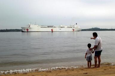 | Keywords: US Navy 050129-N-0493B-007 A Singaporean man shows his son the Military Sealift Command hospital ship USNS Mercy (T-AH 19) as it transits the Johor Strait that separates Singapore and Malaysia.jpg en Singapore Jan 29 2005 - A Singaporean man shows his son the Military Sealift Command hospital ship USNS Mercy T-AH 19 as it transits the Johor Strait that separates Singapore and Malaysia Mercy has been forward deployed to support Operation Unified Assistance the humanitarian operation effort in the wake of the tsunami that struck Southeast Asia Mercy contains twelve fully equipped operating rooms a 1 000-bed hospital facility digital radiological services a diagnostic and clinical laboratory a pharmacy an optometry lab a cat scan and two oxygen-producing plants The hospital ship is a converted San Clemente-class super tanker Mercy is a very visible and humanitarian symbol of not only America s commitment to tsunami victims but also its enduring commitment to the people of the region U S Navy photo by Lt Chuck Bell RELEASED 2005-01-29 050129-N-0493B-007 Navy http //www navy mil/view_image asp id 21316 U S Navy photo by Lt Chuck Bell PD-USGov-Military-Navy Naval ships of the United States in Singapore General views of USNS Mercy T-AH-19 |