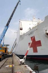 Keywords: US Navy 050129-N-3372S-012 Supplies and medical materials been load onto the Military Sealift Command hospital ship USNS Mercy (T-AH 19).jpg en Singapore Jan 29 2005 - Members of the Naval Expeditionary Logistics Support Force NAVELSF Base Operating Support BOS contractors from the Naval Regional Contracting Center NRCC Singapore and Military Sealift Command mariners load supplies and medical materials onto the Military Sealift Command hospital ship USNS Mercy T-AH 19 Mercy has been forward deployed to support Operation Unified Assistance the humanitarian operation effort in the wake of the tsunami that struck Southeast Asia Mercy contains twelve fully equipped operating rooms a 1 000-bed hospital facility digital radiological services a diagnostic and clinical laboratory a pharmacy an optometry lab a cat scan and two oxygen-producing plants The hospital ship is a converted San Clemente-class super tanker Mercy is a very visible and humanitarian symbol of not only America s commitment to tsunami victims but also its enduring commitment to the people of the region U S Navy photo by Journalist 1st Class Paul G Scherman RELEASED 2005-01-29 050129-N-3372S-012 Navy http //www navy mil/view_image asp id 21318 U S Navy photo by Journalist 1st Class Paul G Scherman PD-USGov-Military-Navy Naval ships of the United States in Singapore American Red Cross Aboard USNS Mercy T-AH-19