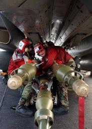 | Keywords: US Navy 050202-N-0382O-501 Aviation Ordnancemen lift a 500-pound GBU-12 laser guided bomb onto a weapon station on one of their squadron^rsquo,s F-14B Tomcats aboard the Nimitz-class aircraft carrier USS Harry S. Truman (CVN 75.jpg en Persian Gulf Feb 2 2005 Aviation Ordnancemen assigned to the Swordsmen of Fighter Squadron 32 VF-32 lift a 500-pound GBU-12 laser guided bomb onto a weapon station on one of their squadron s F-14B Tomcats aboard the Nimitz-class aircraft carrier USS Harry S Truman CVN 75 The GBU-12 Paveway II bomb series are 500 pound smart weapons that follow a laser beam to a target which is illuminated by either an aircraft or a laser designator operator on the ground Carrier Air Wing Three CVW-3 is embarked aboard Truman and is providing close air support and conducting intelligence surveillance and reconnaissance over Iraq The Truman Carrier Strike Group is on a regularly scheduled deployment in support of the global war on terrorism U S Navy photo by Photographer's Mate 3rd Class Justin S Osborne RELEASED 2005-02-02 050202-N-0382O-501 Navy http //www navy mil/view_image asp id 21558 U S Navy photo by Photographer's Mate 3rd Class Justin S Osborne PD-USGov-Military-Navy GBU-12 F-14 Tomcat armament Fighter Squadron 32 United States Navy Aboard USS Harry S Truman CVN-75 |