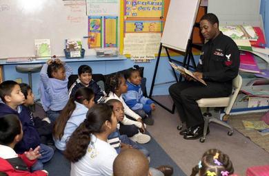 | Keywords: US Navy 050207-N-2143T-009 Operation's Specialist 2nd Class Perry La&-195;&-173;Core, assigned to Commander Cruiser Destroyer Group Eleven (CCSG-11), reads to first graders attending Valencia Park Elementary School in San Diego, Calif.jpg en San Diego Calif Feb 7 2005 - Operation's Specialist 2nd Class Perry LaĆCore assigned to Commander Cruiser Destroyer Group Eleven CCSG-11 reads to first graders attending Valencia Park Elementary School in San Diego Calif Sailors volunteered their time to read to kids once a month; providing educational services to local schools U S Navy photo by Photographer's Mate 3rd Class Maebel Tinoko RELEASED 2005-02-07 050207-N-2143T-009 Navy http //www navy mil/view_image asp id 21740 U S Navy photo by Photographer's Mate 3rd Class Maebel Tinoko PD-USGov-Military-Navy Operations Specialist United States Navy Education in San Diego Reading to children |