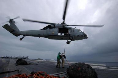 | Keywords: US Navy 050222-N-5781F-151 Supply personnel connect a cargo pendant to an MH-60S Seahawk helicopter, assigned to the Providers of Helicopter Combat Support Squadron Five (HC-5).jpg en Pacific Ocean Feb 22 2005 - Supply personnel connect a cargo pendant to an MH-60S Seahawk helicopter assigned to the Providers of Helicopter Combat Support Squadron Five HC-5 during a vertical replenishment aboard the conventionally-powered aircraft carrier USS Kitty Hawk CV 63 Kitty Hawk demonstrates power projection and sea control as the U S Navy's only forward-deployed aircraft carrier operating from Yokosuka Japan U S Navy photo by Photographer's Mate 3rd Class Bo Flannigan RELEASED 2005-02-22 050222-N-5781F-151 Navy http //www navy mil/view_image asp id 22216 U S Navy photo by Photographer's Mate 3rd Class Bo Flannigan PD-USGov-Military-Navy Aboard USS Kitty Hawk CV-63 |