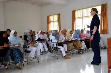| Keywords: US Navy 050223-N-8796S-046 Lt. Terry Moraca, a U.S. Navy nurse and dietitian assigned to the Military Sealift Command (MSC) hospital ship USNS Mercy (T-AH 19), speaks to Indonesian nursing students.jpg en Banda Aceh Sumatra Indonesia Feb 23 2005 Lt Terry Moraca a U S Navy nurse and dietitian assigned to the Military Sealift Command MSC hospital ship USNS Mercy T-AH 19 speaks to Indonesian nursing students about proper diet for patients with diabetes at the University Hospital in Banda Aceh on the island of Sumatra Indonesia Mercy is serving as an enabling platform to assist humanitarian operations ashore in ways that host nations and international relief organization find useful Mercy is currently off the waters of Indonesia in support of Operation Unified Assistance the humanitarian relief effort to aid the victims of the tsunami that struck Southeast Asia U S Navy photo by Photographer's Mate 2nd Class Timothy Smith RELEASED 2005-02-23 050223-N-8796S-046 Navy http //www navy mil/view_image asp id 22177 U S Navy photo by Photographer's Mate 2nd Class Timothy Smith PD-USGov-Military-Navy Banda Aceh Nutritionists Students in Indonesia Nurses |