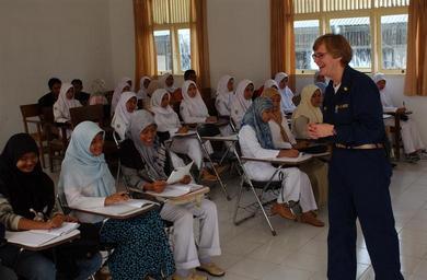 | Keywords: US Navy 050223-N-8796S-085 Cmdr. Suzanne Clark, a U.S. Navy Nurse assigned to the Military Sealift Command (MSC) hospital ship USNS Mercy (T-AH 19), takes questions after giving a lecture on diabetes to Indonesian nursing stude.jpg en Banda Aceh Sumatra Indonesia Feb 23 2005 - Cmdr Suzanne Clark a U S Navy Nurse assigned to the Military Sealift Command MSC hospital ship USNS Mercy T-AH 19 takes questions after giving a lecture on diabetes to Indonesian nursing students at the University Hospital in Banda Aceh on the island of Sumatra Indonesia Mercy is serving as an enabling platform to assist humanitarian operations ashore in ways that host nations and international relief organization find useful Mercy is currently off the waters of Indonesia in support of Operation Unified Assistance the humanitarian relief effort to aid the victims of the tsunami that struck Southeast Asia U S Navy photo by Photographer's Mate 2nd Class Timothy Smith RELEASED 2005-02-23 050223-N-8796S-085 Navy http //www navy mil/view_image asp id 22178 U S Navy photo by Photographer's Mate 2nd Class Timothy Smith PD-USGov-Military-Navy Banda Aceh |