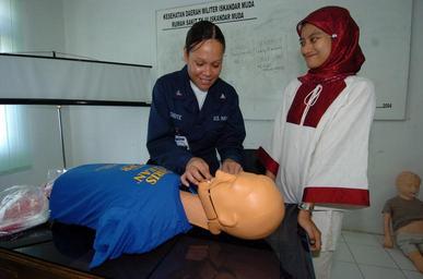 | Keywords: US Navy 050301-N-8629M-127 Hospital Corpsman 3rd Class Lynette Shute instructs Indonesian military and civilian nurses on cardio pulmonary resuscitation.jpg en Banda Aceh Sumatra Indonesia Mar 1 2005 - Hospital Corpsman 3rd Class Lynette Shute assigned to the Military Sealift Command MSC hospital ship USNS Mercy T-AH 19 instructs Indonesian military and civilian nurses on cardio pulmonary resuscitation CPR at Tentera Nasional Indonesia Military Hospital in Banda Aceh Indonesia Mercy is serving as an enabling platform to assist humanitarian operations ashore in ways that host nations and international relief organization find useful Mercy is currently off the waters of Indonesia in support of Operation Unified Assistance the humanitarian relief effort to aid the victims of the tsunami that struck Southeast Asia U S Navy photo by Photographer's Mate 3rd Class Rebecca J Moat RELEASED 2005-03-01 050301-N-8629M-127 Navy http //www navy mil/view_image asp id 22364 U S Navy photo by Photographer's Mate 3rd Class Rebecca J Moat PD-USGov-Military-Navy Banda Aceh Hospital Corpsman |