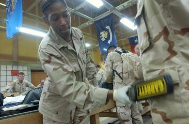 | Keywords: US Navy 050301-N-6027E-002 Culinary Specialist 2nd Class Carrie Lord of Raleigh, N.C., performs a customs inspection on a U.S. Army Soldier at Camp Doha, Kuwait.jpg en Camp Doha Kuwait Mar 1 2005 - Culinary Specialist 2nd Class Carrie Lord of Raleigh N C performs a customs inspection on a U S Army Soldier at Camp Doha Kuwait Petty Officer Lord is a recalled Navy reservist assigned to Naval Expeditionary Logistics Support Force NAVELSF Forward Oscar Bravo Company Forward Oscar recently relieved the U S Air Force's 887th Expeditionary Security Forces Squadron NAVELSF is performing the customs mission for the U S Army throughout Kuwait and Iraq U S Navy photo by Chief Journalist Kevin Elliott RELEASED 2005-03-01 050301-N-6027E-002 Navy http //www navy mil/view_image asp id 22354 U S Navy photo by Chief Journalist Kevin Elliott PD-USGov-Military-Navy Camp Doha Culinary specialist United States Navy |