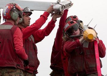 | Keywords: US Navy 050304-N-4308O-086 U.S. Marine ordnancemen carry an AIM-9X Sidewinder missile on their shoulders after unloading the ordnance from an F-A-18A- Hornet.jpg en Persian Gulf Mar 4 2005 U S Marine ordnancemen assigned to the Silver Eagles of Marine Fighter Attack Squadron One One Five VMFA-115 carry an AIM-9X Sidewinder missile on their shoulders after unloading the ordnance from an F/A-18A+ Hornet on the flight deck aboard USS Harry S Truman CVN 75 The AIM-9X is a supersonic heat-seeking air-to-air missile that can be fired day or night and is currently the newest air-to-air missile in the Navy and Marine Corps inventory Carrier Air Wing Three CVW-3 is embarked aboard Truman and is providing close air support and conducting intelligence surveillance and reconnaissance over Iraq The Truman Carrier Strike Group is on a regularly scheduled deployment in support of the Global War on Terrorism U S Navy photo by Photographer's Mate Airman Ryan O'Connor RELEASED 2005-03-04 050304-N-4308O-086 Navy http //www navy mil/view_image asp id 22572 U S Navy photo by Photographer's Mate Airman Ryan O'Connor PD-USGov-Military-Navy AIM-9 Sidewinder Aboard USS Harry S Truman CVN-75 |