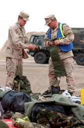 | Keywords: US Navy 050308-N-6027E-002 Aviation Machinist^rsquo,s Mate 1st Class Raymond Echols, right, and U.S. Army Spc. Harvey Bates inspect bags belonging to injured soldiers.jpg en Camp Navistar Kuwait Mar 8 2005 Aviation Machinist s Mate 1st Class Raymond Echols right and U S Army Spc Harvey Bates inspect bags belonging to injured soldiers who've already returned to the United States at Camp Navistar Kuwait Echols is a Navy reservist assigned to Naval Expeditionary Logistics Support Force NAVELSF Forward Oscar Charlie Company on board Camp Navistar in Northern Kuwait Forward Oscar recently relieved the U S Air Force's 887th Expeditionary Security Forces Squadron NAVELSF is performing the customs mission for the U S Army throughout Kuwait and Iraq U S Navy photo by Chief Journalist Kevin Elliott RELEASED 2005-03-08 050308-N-6027E-002 Navy http //www navy mil/view_image asp id 22525 U S Navy photo by Chief Journalist Kevin Elliott PD-USGov-Military-Navy Images from US Navy location Camp Navistar Kuwait Camp Navistar |