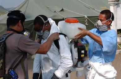 | Keywords: US Navy 050308-N-8796S-037 Chief Hospital Corpsman Alberto Redublo, left, and Hospital Corpsman 2nd Class Richard Cabatit, right, help Hospital Corpsman 3rd Class Ron Berard as he dons his personal protective equipment and back.jpg en Banda Aceh Sumatra Indonesia Mar 8 2005 Chief Hospital Corpsman Alberto Redublo left and Hospital Corpsman 2nd Class Richard Cabatit right help Hospital Corpsman 3rd Class Ron Berard as he dons his personal protective equipment and backpack sprayer The Hospital Corpsmen assigned to Navy Environmental Preventive Medicine Unit Six NEPMU-6 are spraying pesticides to kill flying insects known to spread disease NEPMU-6 is based out of Pearl Harbor Hawaii and is augmented by environmental and preventive medicine personnel from other units across the U S NEPMU-6 is currently operating in Banda Aceh on the island of Sumatra Indonesia and is conducting daily operations to assess health concerns including water soil studies disease and vector control in displaced personnel camps U S Navy photo by Photographer's Mate 2nd Class Timothy Smith RELEASED 2005-03-08 050308-N-8796S-037 Navy http //www navy mil/view_image asp id 22526 U S Navy photo by Photographer's Mate 2nd Class Timothy Smith PD-USGov-Military-Navy Banda Aceh Hospital Corpsman |
