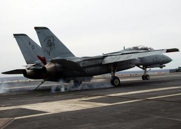 | Keywords: US Navy 050309-N-5832A-004 An F-14D Tomcat makes an arrested landing on the flight deck aboard the Nimitz-class aircraft carrier USS Theodore Roosevelt (CVN 71).jpg en Atlantic Ocean Mar 9 2005 - An F-14D Tomcat assigned to the Grim Reapers of Fighter Squadron 101 VF-101 makes an arrested landing on the flight deck aboard the Nimitz-class aircraft carrier USS Theodore Roosevelt CVN 71 VF-101 is the U S Navy's sole Fleet Replacement Squadron for the F-14 Tomcat training aircrew and maintenance personnel for the fleet The squadron trains pilots radar intercept officers and enlisted personnel in the operation and employment of the F-14 Tomcat fighter The Grim Reapers are currently embarked aboard Roosevelt participating in carrier qualifications in the Atlantic Ocean U S Navy photo by Photographer's Mate Airman Derek A Allen RELEASED 2005-03-09 050309-N-5832A-004 Navy http //www navy mil/view_image asp id 22599 U S Navy photo by Photographer's Mate Airman Derek A Allen PD-USGov-Military-Navy F-14D Tomcat on flight decks F-14 Tomcat aircraft carrier landings Fighter Squadron 101 United States Navy USS Theodore Roosevelt CVN-71 flight deck |