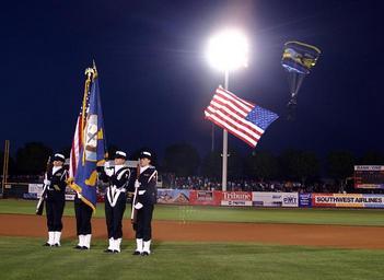 MAKE A MEME View Large Image Navy 050315-N-3271W-006 A color guard from the Navy and Marine Corps Reserve Center, Phoenix, Ariz., post the colors as a U.S. Navy Leap Frogs parachute team member enters the stadium during a Cactus League spring training b.jpg en Phoenix ...