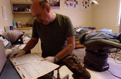 | Keywords: US Navy 050325-F-7169B-029 Navy Capt. Bruce Biermann, a dentist assigned to the Portland, Oregon Reserve Center, reviews the dental records of a Old Harbor resident.jpg en Old Harbor Kodiak Alaska Mar 25 2005 - Navy Capt Bruce Biermann a dentist assigned to the Portland Oregon Reserve Center reviews the dental records of a Old Harbor resident before beginning dental work to a patient s teeth Capt Biermann is in Old Harbor conducting Arctic Care 2005 a multi-service medical readiness and logistics training exercise that is supporting 13 Alaskan Native villages around the state U S Air Force photo by Tech Sgt Keith Brown RELEASED 2005-03-25 050325-F-7169B-029 Navy http //www navy mil/view_image asp id 23190 U S Navy photo PD-USGov-Military-Navy Dentists at work Images from US Navy location Old Harbor Kodiak Alaska |