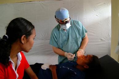 | Keywords: US Navy 050326-N-0357S-021 Cmdr. Mark Roback, a Navy dentist from the Military Sealift Command (MSC) hospital ship USNS Mercy (T-AH 19), speaking to his patient through an interpreter, tells her that the injection he is giving.jpg en Alor Indonesia Mar 26 2005 - Cmdr Mark Roback a Navy dentist from the Military Sealift Command MSC hospital ship USNS Mercy T-AH 19 speaking to his patient through an interpreter tells her that the injection he is giving her will numb the area around her decaying tooth before he extracts it Mercy is currently off the coast of Alor Indonesia to provide humanitarian assistance and focus medical care to thousands of people displaced by a magnitude 7 3 earthquake that struck Nov 11 2004 While ashore Mercy's crew will focus on public health primary care dental treatment preventive medicine health education and pharmaceutical support Mercy's deployment is part of the U S commitment to Southeast Asia and the Pacific Island nations U S Navy photo by Journalist 1st Class Joshua Smith RELEASED 2005-03-26 050326-N-0357S-021 Navy http //www navy mil/view_image asp id 23059 U S Navy photo by Journalist 1st Class Joshua Smith PD-USGov-Military-Navy Images from US Navy location Alor Indonesia Aboard USNS Mercy T-AH-19 Interpreters |