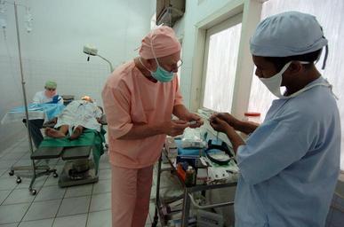 | Keywords: US Navy 050326-N-8629M-160 An Indonesian nurse assists James Pressly, MD as he prepares to perform cataract surgery on an Indonesian woman at the Kalabahi Hospital in Alor, Indonesia.jpg en Alor Indonesia Mar 26 2005 - An Indonesian nurse assists James Pressly MD as he prepares to perform cataract surgery on an Indonesian woman at the Kalabahi Hospital in Alor Indonesia Pressly is part of a group of medical professionals from the Military Sealift Command MSC hospital ship USNS Mercy T-AH 19 Mercy is currently off the coast of Alor Indonesia to provide humanitarian assistance and focus medical care to thousands of people displaced by a magnitude 7 3 earthquake that struck Nov 11 2004 While ashore Mercy's crew will focus on public health primary care dental treatment preventive medicine health education and pharmaceutical support Mercy's deployment is part of the U S commitment to Southeast Asia and the Pacific Island nations U S Navy photo by Photographer's Mate 3rd Class Rebecca J Moat RELEASED 2005-03-26 050326-N-8629M-160 Navy http //www navy mil/view_image asp id 23101 U S Navy photo by Photographer's Mate 3rd Class Rebecca J Moat PD-USGov-Military-Navy Images from US Navy location Alor Indonesia Aboard USNS Mercy T-AH-19 Cataract surgery |