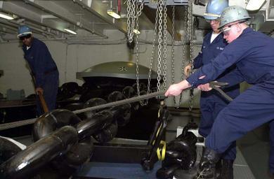 | Keywords: US Navy 050328-N-7538D-032 Deck Department personnel secure the anchor chain in the ship^rsquo,s forecastle aboard USS Nimitz (CVN 68).jpg en Pacific Ocean Mar 29 2005 - Deck Department personnel secure the anchor chain in the ship s forecastle aboard USS Nimitz CVN 68 Nimitz is currently conducting Fleet Replacement Squadron Carrier Qualifications off the coast of Southern California U S Navy photo by Photographer s Mate Airman Recruit Matthew Dammann RELEASED 2005-03-29 050328-N-7538D-032 Navy http //www navy mil/view_image asp id 23171 U S Navy photo by Photographer s Mate Airman Recruit Matthew Dammann PD-USGov-Military-Navy Aboard USS Nimitz CVN-68 Anchor chains |