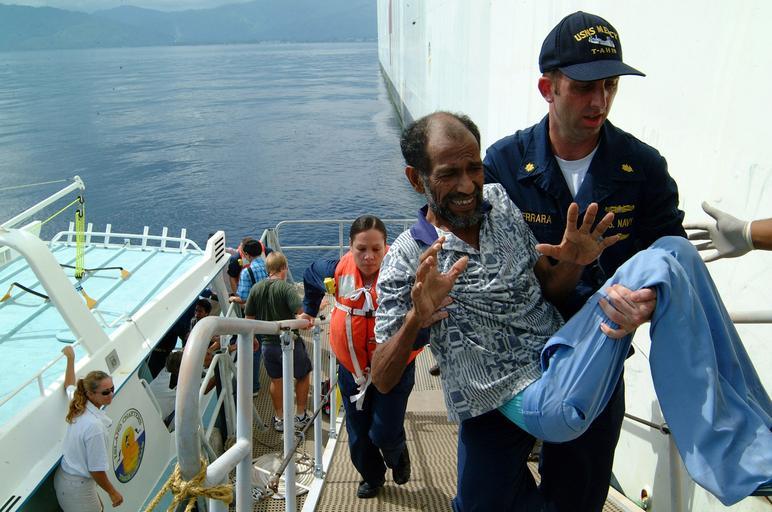| Keywords: US Navy 050330-N-6504N-006 Lt. Cmdr. Stephen Ferrara, head of the Radiology Department aboard the Military Sealift Command (MSC) hospital ship USNS Mercy (T-AH 19) carries an East Timorese man aboard Mercy.jpg en Dili East Timor Mar 29 2005 Lt Cmdr Stephen Ferrara head of the Radiology Department aboard the Military Sealift Command MSC hospital ship USNS Mercy T-AH 19 carries an East Timorese man aboard Mercy for treatment Mercy is currently off the coast of Dili East Timor providing humanitarian assistance and focused medical care to thousands of people displaced by a magnitude 7 3 earthquake that struck Nov 11 2004 While ashore Mercy s crew will focus on public health primary care dental treatment preventive medicine health education and pharmaceutical support Mercy s deployment is part of the U S commitment to Southeast Asia and the Pacific Island nations U S Navy photo by Journalist 3rd Class Isaac Needleman RELEASED 2005-03-29 050330-N-6504N-006 Navy http //www navy mil/view_image asp id 23152 U S Navy photo by Journalist 3rd Class Isaac Needleman PD-USGov-Military-Navy Aboard USNS Mercy T-AH-19 Healthcare in East Timor United States Navy images from East Timor |