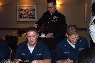 | Keywords: US Navy 050403-N-6832D-001 Marine Capt. Grant Heinrichs, center, serves Seaman Jacob Gabriel, left, and Culinary Specialist 3rd Class Evan Daniels coffee.jpg en Sea of Japan Apr 3 2005 - Marine Capt Grant Heinrichs center serves Seaman Jacob Gabriel left and Culinary Specialist 3rd Class Evan Daniels coffee during a special Serve the Servers' meal in the Seventh Fleet Flag Mess aboard USS Blue Ridge LCC 19 Navy and Marine Corps officers volunteered to return the good service of the Culinary Specialist by serving and clearing a dinner meal for the enlisted staff U S Navy photo by Journalist 1st Class Brianna Dandridge RELEASED 2005-04-03 050403-N-6832D-001 Navy http //www navy mil/view_image asp id 23326 U S Navy photo by Journalist 1st Class Brianna Dandridge PD-USGov-Military-Navy Culinary specialist United States Navy Aboard USS Blue Ridge LCC-19 |
