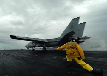 | Keywords: US Navy 050413-N-8704K-001 A catapult shooter signals the launch of an F-14D Tomcat.jpg en Atlantic Ocean Apr 13 2005 - A catapult shooter signals the launch of an F-14D Tomcat assigned to the Grim Reapers of Fighter Squadron One Zero One VF-101 aboard the conventionally powered aircraft carrier USS John F Kennedy CV 67 VF-101 is the U S Navy's sole Fleet Replacement Squadron for the F-14 Tomcat training aircrew and maintenance personnel for the fleet The squadron trains pilots radar intercept officers and enlisted personnel in the operation and employment of the F-14B/D Tomcat fighter The Mayport Fla based aircraft carrier Kennedy is currently conducting scheduled carrier qualification in the Atlantic Ocean U S Navy photo by Photographer s Mate 3rd Class Joshua Karsten RELEASED 2005-04-13 050413-N-8704K-001 Navy http //www navy mil/view_image asp id 23553 U S Navy photo by Photographer s Mate 3rd Class Joshua Karsten PD-USGov-Military-Navy F-14D Tomcat on flight decks F-14 Tomcat aircraft carrier launches Fighter Squadron 101 United States Navy Aboard USS John F Kennedy CV-67 |