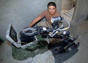 | Keywords: US Navy 050414-N-5526M-002 Chief Quartermaster Daniel Mediace ensures the retractable arm of the Talon 3B Robot Unit is functioning properly.jpg en Manama Bahrain June 14 2005 - Chief Quartermaster Daniel Mediace from Chicago Ill assigned to Explosive Ordnance Disposal Mobile Unit Eight EODMU-8 Detachment 2 ensures the retractable arm of the Talon 3B Robot Unit is functioning properly before sending it out during a training mission at a Bahrain training range The Talon 3B robot is designed for the search and destruction of Improvised Explosive Devices IED s as well as other forms of ordnance found in Iraq U S Navy photo by Photographer's Mate 1st Class Robert R McRill RELEASED 2005-06-14 050414-N-5526M-002 Navy http //www navy mil/view_image asp id 25394 U S Navy photo by Photographer's Mate 1st Class Robert R McRill PD-USGov-Military-Navy United States Navy Explosive Ordnance Disposal Quartermaster United States Navy US Navy in Manama Bahrain EOD robots Explosive Ordnance Disposal Mobile Unit 8 Photographs by Robert R McRill |