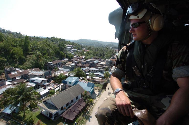 | Keywords: US Navy 050420-N-8629M-216 Master-at-Arms Seaman James Vanroy looks out from the cabin of an MH-60S Seahawk helicopter, over Nias, Indonesia.jpg en Nias Indonesia April 20 2005 Master-at-Arms Seaman James Vanroy looks out from the cabin of an MH-60S Seahawk helicopter over Nias Indonesia on his flight back to the Military Sealift Command MSC hospital ship USNS Mercy T-AH 19 after a day of assisting with security on shore At the request of the government of Indonesia the Military Sealift Command MSC hospital ship USNS Mercy T-AH 19 MSC combat stores ships USNS Niagara Falls T-AFS 3 and USNS San Jose T-AFS 7 are on station off the coast of Nias providing assistance as determined appropriate and necessary with earthquake disaster relief efforts and provide medical assistance to those in need U S Navy photo by Photographer's Mate 3rd Class Rebecca J Moat RELEASED 2005-04-20 050420-N-8629M-216 Navy http //www navy mil/view_image asp id 23791 U S Navy photo by Photographer's Mate 3rd Class Rebecca J Moat PD-USGov-Military-Navy Images from US Navy location Nias Indonesia Master-at-arms Aboard USNS Mercy T-AH-19 |