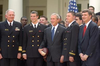 | Keywords: US Navy 050420-N-0000A-003 President George W. Bush, center, poses for a photograph with members of the U.S. Naval Academy football team fter the presentation of the Commander-In-Chief's Trophy in Rose Garden at the White Hous.jpg en Washington D C April 20 2005 - President George W Bush center poses for a photograph with members of the U S Naval Academy football team fter the presentation of the Commander-In-Chief's Trophy in Rose Garden at the White House President Bush hailed Navy's football team Wednesday for winning the Commander-In-Chief's trophy for the second year in a row The trophy goes each year to the team with the best record in games between the three service academies Navy finished the year with a school-record tying 10 victories marking the first time in 99 years that Navy has won 10 football games in a single season Navy beat Air Force 24-21 and Army 34-6 Photo by Carolyn Andros courtesy U S Naval Academy Athletic Associaion RELEASED 2005-04-20 050420-N-0000A-003 Navy http //www navy mil/view_image asp id 23740 U S Navy photo PD-USGov-Military-Navy People of the United States Navy George W Bush in 2005 |