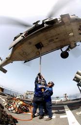 | Keywords: US Navy 050514-N-5526M-006 Seaman Ruslan Stanischevskiy and Seaman John Parker both assigned to Deck Department aboard the guided missile cruiser USS Normandy (CG 60), attach a cargo pendant to an MH-60S Seahawk helicopter.jpg en Gulf of Aden May 14 2005 - Seaman Ruslan Stanischevskiy and Seaman John Parker both assigned to Deck Department aboard the guided missile cruiser USS Normandy CG 60 attach a cargo pendant to an MH-60S Seahawk helicopter Normandy conducted a vertical replenishment at sea with the fast combat support ship USS Camden AOE 2 Normandy is currently conducting Maritime Security Operations MSO in the 5th Fleet area of responsibility U S Navy photo by Photographer's Mate 1st Class Robert R McRill RELEASED 2005-05-14 050514-N-5526M-006 Navy http //www navy mil/view_image asp id 24412 U S Navy photo by Photographer's Mate 1st Class Robert R McRill PD-USGov-Military-Navy MH-60S helihoisting cargo USS Camden AOE-2 Aboard USS Normandy CG-60 Photographs by Robert R McRill |