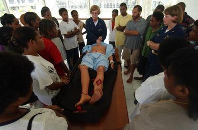 | Keywords: US Navy 050516-N-7027P-118 Cmdr. Susanne Clark and Jeanie Comlish assigned to the Military Sealift Command (MSC) hospital ship USNS Mercy.jpg en Madang Papua New Guinea May 16 2005 - Cmdr Susanne Clark and Jeanie Comlish assigned to the Military Sealift Command MSC hospital ship USNS Mercy T-AH 19 demonstrate how to assess an injured patient upon arrival to the emergency room to the nursing students at the Lutheran School of Nursing in Madang Papua New Guinea Mercy and the MSC combat stores ship USNS Niagara Falls T-AFS 3 are on station off the coast of Papua New Guinea to provide humanitarian assistance and focused medical care to the residents of the area Mercy is en route to its homeport of San Diego after taking part in Operation Unified Assistance in support of tsunami and earthquake relief operations in Indonesia U S Navy photo by Photographer's Mate 2nd Class Sandra M Palumbo RELEASED 2005-05-16 050516-N-7027P-118 Navy http //www navy mil/view_image asp id 24351 U S Navy photo by Photographer's Mate 2nd Class Sandra M Palumbo PD-USGov-Military-Navy Images from US Navy ship USNS Mercy T-AH 19 Madang |
