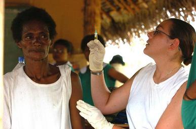 | Keywords: US Navy 050518-N-1485H-006 Hospitalman Jessica Mayer of Mariss, Ill., preps a syringe filled with measles, mumps and rubella vaccination before injecting a local woman the local village of Potts Dam.jpg en Potts Dam Papua New Guinea May 18 2005 Hospitalman Jessica Mayer of Mariss Ill preps a syringe filled with measles mumps and rubella vaccination before injecting a local woman the local village of Potts Dam The Military Sealift Command MSC hospital ship USNS Mercy T-AH 19 and the MSC combat stores ship USNS Niagara Falls T-AFS 3 are currently station off the coast of Papua New Guinea to provide humanitarian assistance and focused medical care to the residents affected by a volcano eruption in the area Navy photo by Photographer's Mate 3rd Class Lamel J Hinton RELEASED 2005-05-18 050518-N-1485H-006 Navy http //www navy mil/view_image asp id 24476 U S Navy photo PD-USGov-Military-Navy Images from US Navy location Potts Dam Papua New Guinea |