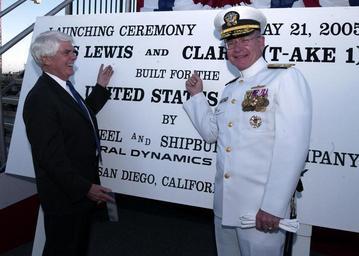 Keywords: US Navy 050521-N-1577S-032 Chief of Naval Operations Adm. Vern Clark and Congressman Jerry Lewis (R-CA), pose for photographs.jpg en San Diego Calif May 21 2005 - Chief of Naval Operations Adm Vern Clark and Congressman Jerry Lewis R-CA pose for photographs before the christening ceremony for the Military Sealift Command MSC auxiliary dry cargo carrier USNS Lewis and Clark T-AKE 1 Lewis and Clark is the first of the newest class of underway replenishment ships built for naval service and is named in honor of the legendary explorers Direct descendents of Capt Meriwether Lewis and Capt William Clark Mrs Jane Lewis Sale Henley and Ms Lisa Clark were on hand to help celebrate the launching of their ancestor's namesake U S Navy photo by Photographer's Mate 3rd Class Timothy F Sosa RELEASED 2005-05-21 050521-N-1577S-032 Navy http //www navy mil/view_image asp id 24585 U S Navy photo by Photographer's Mate 3rd Class Timothy F Sosa PD-USGov-Military-Navy National Steel and Shipbuilding Company Vern Clark Ship christenings in the United States Navy USNS Lewis and Clark T-AKE-1