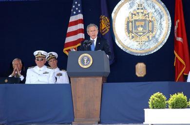 | Keywords: US Navy 050527-F-7379W-192 President George W. Bush delivers his remarks as part of the U.S. Naval Academy class of 2005 Graduation and Commissioning Ceremony.jpg en Annapolis Md May 27 2005 - President George W Bush delivers his remarks as part of the U S Naval Academy class of 2005 Graduation and Commissioning Ceremony Nine hundred seventy-six Midshipmen graduated from the U S Naval Academy and became commissioned officers in the U S Military President Bush delivered the commencement address and personally greeted each graduate during the ceremony The men and women of the graduating class were sworn into the Navy as Ensigns or into the Marine Corps as Second Lieutenants U S Air Force photo by Staff Sgt Charles Walker RELEASED 2005-05-27 050527-F-7379W-192 Navy http //www navy mil/view_image asp id 24808 U S Navy photo PD-USGov-Military-Navy Graduation and Commissioning Ceremony May 27 2005 |