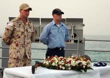 | Keywords: US Navy 050606-N-1825E-099 U.S. and Royal Australian Navy (RAN) Sailors aboard the guided missile cruiser USS Normandy (CG 60), stand side-by-side to honor World War II D-Day veterans during an early evening memorial ceremony.jpg en Persian Gulf June 6 2005 - U S and Royal Australian Navy RAN Sailors aboard the guided missile cruiser USS Normandy CG 60 stand side-by-side to honor World War II D-Day veterans during an early evening memorial ceremony The hour-long service marked the 61st anniversary of coalition allies storming the beaches of Normandy France June 6 1944 The crew gathered on the fantail of the ship and listened to words of remembrance from the commanding officer and from family members of those who took part in D-Day invasion The Commander Task Force Five Eight CTF-58 flagship is conducting maritime security operations MSO in the region MSO sets the conditions for security and stability in the maritime environment U S Navy photo by Journalist 3rd Class Joseph Ebalo RELEASED 2005-06-06 050606-N-1825E-099 Navy http //www navy mil/view_image asp id 25153 U S Navy photo by Journalist 3rd Class Joseph Ebalo PD-USGov-Military-Navy Aboard USS Normandy CG-60 Royal Australian Navy D-Day anniversaries |
