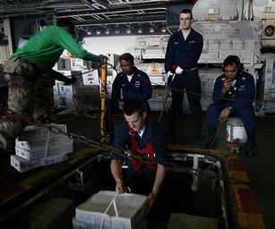 | Keywords: US Navy 050618-N-6009S-006 Supply Department personnel use a vertical conveyer to lower stores to a cargo hold during a replenishment at sea aboard the conventionally powered aircraft carrier USS Kitty Hawk (CV 63).jpg en Coral Sea June 18 2005 - Supply Department personnel use a vertical conveyer to lower stores to a cargo hold during a replenishment at sea aboard the conventionally powered aircraft carrier USS Kitty Hawk CV 63 Kitty Hawk is currently operating in the Coral Sea in support of Exercise Talisman Sabre 2005 Talisman Sabre is an exercise jointly sponsored by the U S Pacific Command and Australian Defense Force Joint Operations Command and designed to train the U S Seventh Fleet commander's staff and Australian Joint Operations staff as a designated Combined Task Force CTF headquarters The exercise focuses on crisis action planning and execution of contingency response operations U S Pacific Command units and Australian forces will conduct land sea and air training throughout the training area More than 11 000 U S and 6 000 Australian personnel will participate U S Navy photo by Photographer's Mate 1st Class Hana'lei Shimana RELEASED 2005-06-18 050618-N-6009S-006 Navy http //www navy mil/view_image asp id 25440 U S Navy photo by Photographer's Mate 1st Class Hana'lei Shimana PD-USGov-Military-Navy Underway replenishment Aboard USS Kitty Hawk CV-63 Talisman Sabre 2005 |
