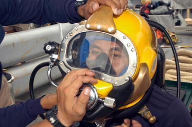 | Keywords: US Navy 050621-N-4104L-022 With the help of U.S. Navy divers assigned to the rescue and salvage ship USS Safeguard (ARS 50), a Royal Thai Navy (RTN) diver dons a MK-21 dive helmet in preparation for a combined U.S. Navy and RTN.jpg en Sattahip Thailand June 21 2005 - With the help of U S Navy divers assigned to the rescue and salvage ship USS Safeguard ARS 50 a Royal Thai Navy RTN diver dons a MK-21 dive helmet in preparation for a combined U S Navy and RTN indoctrination dive Safeguard and RTN divers went through the familiarization process in preparation for an open ocean dive during the at-sea phase of exercise Cooperation Afloat Readiness and Training CARAT 2005 CARAT is a regularly scheduled series of bilateral military training exercises with several Southeast Asia nations designed to enhance the interoperability of the respective sea services U S Navy photo by Chief Journalist Melinda Larson RELEASED 2005-06-21 050621-N-4104L-022 Navy http //www navy mil/view_image asp id 25523 U S Navy photo by Chief Journalist Melinda Larson PD-USGov-Military-Navy Images from US Navy location Sattahip Thailand Aboard USNS Safeguard T-ARS-50 MK-21 diving helmet |