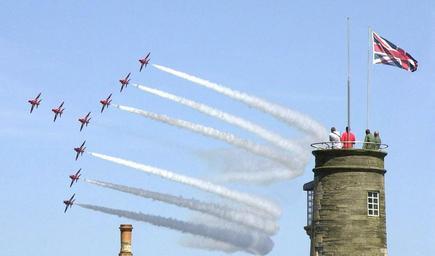 | Keywords: US Navy 050626-N-9565D-009 The British Royal Air Force aerial demonstration team, the Red Arrows, conduct a fly-by during the World War II celebrations.jpg en Whitehaven Cumbria United Kingdom June 26 2005 - The British Royal Air Force aerial demonstration team the Red Arrows conduct a fly-by during the World War II celebrations at the Whitehaven Maritime Festival The festival commerates the British American Naval connections when John Paul Jones successfully attacked this port the last time England has been invaded since 1778 along with the 60th anniversary celebrations remembering World War II U S Navy photo by Photographer's Mate 2nd Class Clifford L H Davis RELEASED 2005-06-26 050626-N-9565D-009 Navy http //www navy mil/view_image asp id 25739 U S Navy photo by Photographer's Mate 2nd Class Clifford L H Davis PD-USGov-Military-Navy Images from US Navy location Whitehaven Cumbria United Kingdom Aircraft formation flight of the Red Arrows BAE Hawk in the 2000s Smoke trails of aerobatic teams |