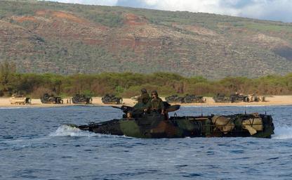 | Keywords: US Navy 050628-N-9866B-057 U.S. Marines assigned to the 3rd Amphibious Assault Battalion, navigate their Amphibious Assault Vehicle (AAV) through the Pacific Ocean.jpg en Pacific Ocean June 28 2005 - U S Marines assigned to the 3rd Amphibious Assault Battalion navigate their Amphibious Assault Vehicle AAV through the Pacific Ocean after departing the amphibious assault ship USS Peleliu LHA 5 off the shores of Hawaii Sailors and Marines assigned to the amphibious assault ship USS Peleliu LHA 5 are currently conducting amphibious training on the beaches of Pacific Missile Range Facility on the island of Kauai Hawaii U S Navy photo by Journalist 2nd Class Zack Baddorf RELEASED 2005-06-28 050628-N-9866B-057 Navy http //www navy mil/view_image asp id 25810 U S Navy photo by Journalist 2nd Class Zack Baddorf PD-USGov-Military-Navy Amphibious Assault Vehicle Aboard USS Peleliu LHA-5 3rd_Assault_Amphibian_Battalion |
