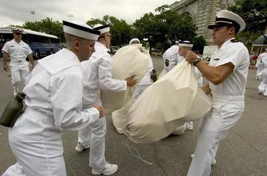 | Keywords: US Navy 050629-N-9693M-299 Prospective Midshipmen retrieve their.jpg en Annapolis Md June 29 2005 - Prospective Midshipmen retrieve their Sea Bags under instruction from a 1st Class Midshipman prior to entering Bancroft Hall at the United States Naval Academy in Annapolis Md Approximately 1200 prospective Midshipmen 4th Class Plebes reported to the Academy for Induction into the class of 2009 and the first day of Plebe summer The Plebes were cycled through a series of stations to establish medical and dental records receive uniforms complete paperwork and receive their military haircut U S Navy photo by Mr Damon J Moritz RELEASED 2005-06-29 050629-N-9693M-299 Navy http //www navy mil/view_image asp id 25762 U S Navy photo by Mr Damon J Moritz PD-USGov-Military-Navy United States Naval Academy Induction Day Sailor suits |