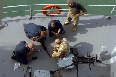 | Keywords: US Navy 050704-N-4309A-057 Sailors assigned to the amphibious dock landing ship USS Ashland (LSD 48) and the Royal Navy help clean a Polish-made 50-cal DSKA aboard an Iraqi patrol boat while it refuels with the Ashland.jpg en Persian Gulf July 4 2005 Sailors assigned to the amphibious dock landing ship USS Ashland LSD 48 and the Royal Navy help clean a Polish-made 50-cal DSKA aboard an Iraqi patrol boat while it refuels with the Ashland Ashland is combining efforts with coalition forces under the flag of Commander Task Force Five Eight CTF-58 in support of maritime security operations MSO by conducting security support for the Iraqi oil platforms U S Navy Photo by Photographer's Mate 1st Class Aaron Ansarov RELEASED 2005-07-04 050704-N-4309A-057 Navy http //www navy mil/view_image asp id 26035 U S Navy Photo by Photographer's Mate 1st Class Aaron Ansarov PD-USGov-Military-Navy Aboard USS Ashland LSD-48 |