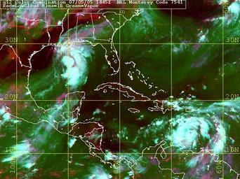MAKE A MEME View Large Image Navy 050705-N-0000X-004 Satellite image showing low cloud, infrared and vapor reflections of three tropical storms.jpg en Gulf of Mexico July 5 2005 Satellite image showing low cloud infrared and vapor reflections of three tropical storms ...