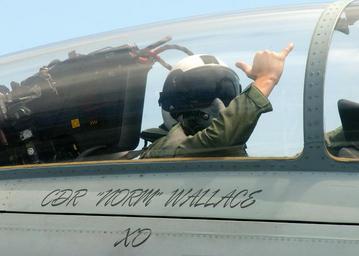 | Keywords: US Navy 050719-N-5345W-004 A Radar Intercept Officer (RIO) gives a hang loose sign to the crowd of Air Department and squadron Sailors gathered on the flight deck.jpg en Atlantic Ocean July 19 2005 A Radar Intercept Officer RIO assigned to the Swordsmen of Fighter Squadron 32 VF-32 gives a hang loose sign to the crowd of Air Department and squadron Sailors gathered on the flight deck from the cockpit of his F-14B Tomcat prior to launching from the Nimitz-class aircraft carrier USS Harry S Truman CVN 75 The current underway-period marks the final time the F-14 Tomcat will take part in flight operations while embarked aboard Truman VF-32 will shortly begin the process of transitioning to the newer F/A-18F Super Hornet Truman is currently conducting carrier qualifications and operations off the East Coast and is also participating in a Joint Task Force Exercise JTFEX with USS Theodore Roosevelt CVN 71 JTFEX is a key component in the training cycle of an aircraft carrier and carrier air wing in the U S Navy Fleet Response Plan U S Navy photo by Photographer's Mate 3rd Class Kristopher Wilson RELEASED 2005-07-19 050719-N-5345W-004 Navy http //www navy mil/view_image asp id 26378 U S Navy photo by Photographer's Mate 3rd Class Kristopher Wilson PD-USGov-Military-Navy United States naval aviators F-14 Tomcat aircraft carrier launches Fighter Squadron 32 United States Navy Aboard USS Theodore Roosevelt CVN-71 |