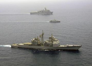 | Keywords: US Navy 050719-N-5526M-014 The guided missile cruiser USS Philippine Sea (CG 58), amphibious dock landing ship USS Gunston Hall (LSD 44), and Al Jawf class His Majesty's Ship (HMS) Shaqra (MHC 422) conduct Surface Action Group.jpg en Persian Gulf July 19 2005 - The guided missile cruiser USS Philippine Sea CG 58 amphibious dock landing ship USS Gunston Hall LSD 44 and Al Jawf class His Majesty's Ship HMS Shaqra MHC 422 conduct Surface Action Group operations during exercise Nautical Union Nautical Union is a joint exercise directed through Commander Destroyer Squadron Five Zero COMDESRON 50 between the U S and coalition forces Nautical Union operations include conducting Maritime Security Operations MSO training air defense anti submarine warfare surface warfare mine counter measures electronic warfare replenishment at sea RAS and command and control Maritime Security Operations MSO set the conditions for security and stability in the maritime environment as well as complements the counter-terrorism and security efforts of regional nations U S Navy photo by Photographer's Mate 1st class Robert R McRill RELEASED 050719-N-5526M-014 Navy http //www navy mil/view_image asp id 26596 U S Navy photo by Photographer's Mate 1st class Robert R McRill PD-USGov-Military-Navy USS Philippine Sea CG-58 General views of USS Gunston Hall LSD-44 Underway replenishment Navy of Saudi Arabia Photographs by Robert R McRill |
