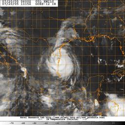 | Keywords: US Navy 050720-N-0000W-002 Satellite image taken from the GOES-12 satellite of Hurricane Emily.jpg en Gulf of Mexico July 20 2005 - Satellite image taken from the GOES-12 satellite of Hurricane Emily At 11 p m EDT 0300 GMT the storm's center was 120 miles southeast of Brownsville Texas and moving west-northwest at a slow 7 mph 11 kph Emily is a dangerous category three hurricane on the Saffir-Simpson scale with maximum sustained winds near 125 mph 205 km/hr Emily's center was expected to hit land some 150 miles south of the U S Mexico border near low-lying fishing communities Heavy rain was seen likely in mountainous regions further inland and forecasters warned of life-threatening flash floods and mudslides Emily killed five people in Jamaica in its swing through the Caribbean as a Category 4 hurricane and several people died in Mexico in incidents indirectly caused by the storm The storm was set for its second landing on Mexico after dropping into the Caribbean coast on Monday sending tourists and locals to shelters in beach resorts in and around Cancun Mexican oil exports were suspended and not set to restart until Wednesday after oil operations in the southern Gulf of Mexico were halted due to the hurricane U S Gulf of Mexico oil and natural gas producers expected little to no damage U S Navy photo RELEASED 2005-07-20 050720-N-0000W-002 Navy http //www navy mil/view_image asp id 26342 U S Navy photo PD-USGov-Military-Navy Satellite pictures of the Gulf of Mexico Satellite pictures of hurricanes GOES 12 pictures |