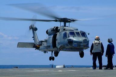 | Keywords: US Navy 050801-N-4772B-088 An SH 60B Seahawk helicopter assigned to Helicopter Anti-submarine Squadron Light Four Five (HSL-45) detachment one lands onto the flight deck of the amphibious dock landing.jpg en South China Sea Aug 1 2005 - An SH 60B Seahawk helicopter assigned to Helicopter Anti-submarine Squadron Light Four Five HSL-45 detachment one lands onto the flight deck of the amphibious dock landing ship USS Harpers Ferry LSD 49 for deck landing qualifications DLQ HSL-45 based at Naval Air Station North Island is embarked aboard the guided missile frigate USS Rodney M Davis FFG 60 Rodney M Davis and Harpers Ferry are transiting to Brunei for the 5th phase of Cooperation Afloat Readiness and Training CARAT 2005 CARAT is an annual series of bilateral military training exercises with several Southeast Asian nations designed to enhance interoperability of the respective sea services U S Navy photo by Journalist 2nd Class Brian P Biller RELEASED 2005-08-01 050801-N-4772B-088 Navy http //www navy mil/view_image asp id 26795 U S Navy photo by Journalist 2nd Class Brian P Biller PD-USGov-Military-Navy USS Harpers Ferry LSD-49 SH-60B Seahawk Helicopter Maritime Strike Squadron 75 United States Navy |