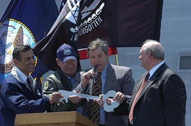 Keywords: US Navy 050801-N-7676W-629 San Diego Congressmen welcome Chairman of the Board, President and Chief Executive Officer of Titan Corporation, Dr. Gene W. Ray, right, to the podium during a welcoming ceremony for Sea Fighter (FSF.jpg en San Diego Calif Aug 1 2005 - Congressman Darrell Issa R-San Diego left Congressman Randy Duke Cunningham R-San Diego left center and Congressman Duncan Hunter R-San Diego right center welcome Chairman of the Board President and Chief Executive Officer of Titan Corporation Dr Gene W Ray right to the podium during a welcoming ceremony for Sea Fighter FSF 1 Developed by the Office of Naval Research ONR Sea Fighter is a high-speed aluminum catamaran that will test a variety of technologies that will allow the Navy to operate in littoral waters U S Navy Photograph by John F Williams RELEASED 2005-08-01 050801-N-7676W-629 Navy http //www navy mil/view_image asp id 26798 U S Navy photo PD-USGov-Military-Navy Naval Base San Diego in the 2000s Sea Fighter ship 2005