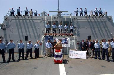 Keywords: US Navy 050802-N-0685S-018 USS Halsey (DDG 97) Commanding Officer, Cmdr. James L. Autrey, welcomes Fox Home Entertainment, USO representatives and actress Pamela Anderson aboard the newly-commissioned guided missile destroyer.jpg en San Diego Calif Aug 02 2005 - USS Halsey DDG 97 Commanding Officer Cmdr James L Autrey welcomes Fox Home Entertainment USO representatives and actress Pamela Anderson aboard the newly-commissioned guided missile destroyer Anderson visited the ship to present the USO with a 150 000 donation from Fox Home Entertainment in commemoration of the historic World War II event VJ Day U S Navy Photo by Photographer's Mate 3rd Class Jo A Wilbourn Sims RELEASED 2005-08-02 050802-N-0685S-018 Navy http //www navy mil/view_image asp id 26874 U S Navy Photo by Photographer's Mate 3rd Class Jo A Wilbourn Sims PD-USGov-Military-Navy Naval Base San Diego in the 2000s USS Halsey DDG-97
