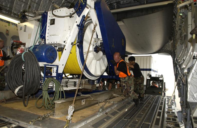 | Keywords: US Navy 050805-F-M8968-010 Deep Drone ROV is prepared for deployment.jpg en Andrews Air Force Base AFB Md August 5 2005 - Members of the 89th Aerial Port Squadron APS Andrews AFB and 32nd APS Air Reserve Squadron Pittsburgh Pa load Deep Drone 8000 support equipment onto a C-17 Globemaster III from Charleston South Carolina The U S Navy Supervisor of Salvage and Diving SUPSALV is deploying a Deep Drone 8000 Remotely Operated Vehicle ROV capable of operating at a depth up to 8000 feet The Deep Drone 8000 has a target locating sonar and two tool manipulators capable of working with tools and attaching rigging The Navy and Air Force are transporting Deep Drone in an effort to assist the rescue of seven Russian Sailors trapped on the ocean floor in a mini-submarine off the Kamchatka Peninsula U S Air Force photo by SSgt Christopher J Matthews RELEASED 050805-F-M8968-010 Navy http //www navy mil/view_image asp id 26917 U S Navy photo PD-USGov-Military-Navy Joint Base Andrews Naval Air Facility Deep Drone Transport of vehicles by Boeing C-17 Globemaster III |